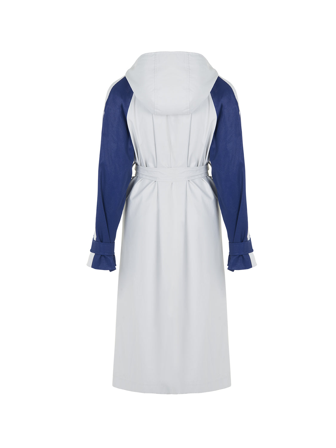 Oversized trench coat with self-belt, hood and epaulettes on shoulders. Long sleeves with text detail. Front snap button closure and side pockets.